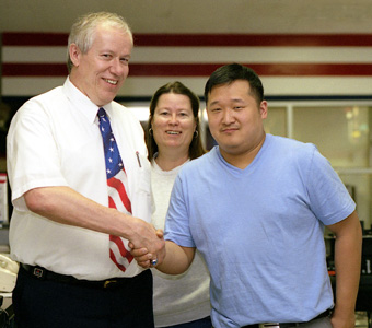 Jae Choi (right) talks about his first year as general manager of U.S. Bowling in the BOWL Magazine Interview. NCABA Past President and ABC Director-at-Large Tom Dale Jr. appears with Deborah Smith, the center's computer operator.