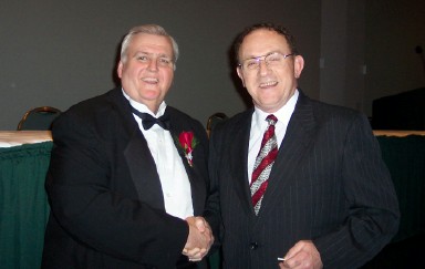NCABA Executive Director Ray Brothers (right) extends congratulations to 2003-2004 American Bowling Congress President Alton Forbes of Chesapeake, Va., at his installation dinner in Virginia Beach.