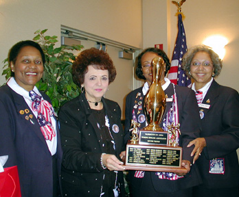 Delores Gildea (second from left), secretary of the Tuesday Tryers league at AMF Laurel, accepts the WDCAWBA Roving Trophy for her center to showcase for the next 12 months for its having the most representatives at the annual meeting. President Poindexter (left), Director Lillie Eason-White, and President-Elect Vaughan join in the presentation.