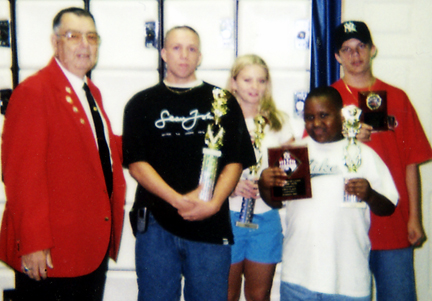 Director Richard Anderson (left) appears with winners in the Youth Trios league, (from left) Neal Miskell (high average male — 179), Kristie Baxter (high average female — 143), Paul Brown (first-place team member), and Anthony Morella (third-place team member).