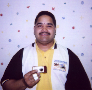 Rafael Medina displays the ABC ring he earned for his 298 game.