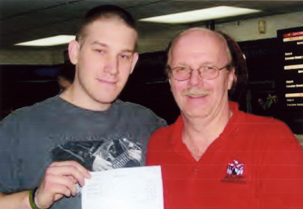 On April 2, Chris Merrill (left) became the first youth league member to toss a perfect game at AMF Dale City when he did so in the Majors Youth league, scoring 205-300-215/720. He appears with coach Jim Christie. (Photo By Ted Gruszkowski Jr.)