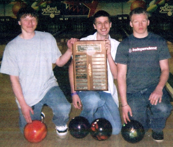 The Osbourn High School students team of (from left) Nathan Caudill, Mark Kvitkovich, and Sean Caudill won the Northern Virginia High School Invitational Championship at Bowl America Manassas on April 3. (Photo By Ted Gruszkowski Jr.)